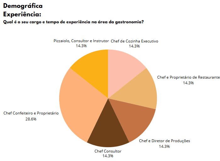Os chefs que participaram da pesquisa possuem cargos e tempos de experiência variados na área da gastronomia, com destaque para chefs de cozinha, proprietários, consultores e confeiteiros. A diversidade de profissionais demonstra a abrangência do uso do alho negro em diferentes áreas da gastronomia.