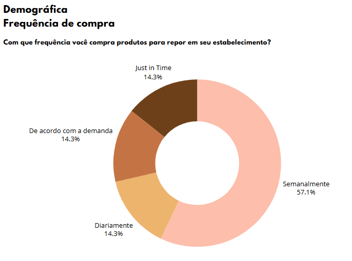 Os chefs que participaram da pesquisa possuem diferentes frequências de compra de produtos para seus estabelecimentos, variando de acordo com o tipo de negócio, demanda e perecibilidade dos alimentos.